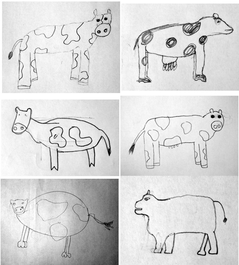 The children's drawings are to some extent symbolic rather than representational. They know some facts about cows: they have horns, spots, udders, hooves, rounded nostrils etc., and this information is all entered into the drawings in a somewhat careless and haphazard way. Notice how, in one drawing, the udder's position is quite off. And those round nostrils surely come from picture books rather than observations of real cows. In other words, their drawings are in a way actually picture-like symbols or ideograms rather than drawings. As in early writing systems, their drawings are depictions of the idea of a cow rather than attempts at showing what real cows actually look like.